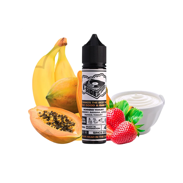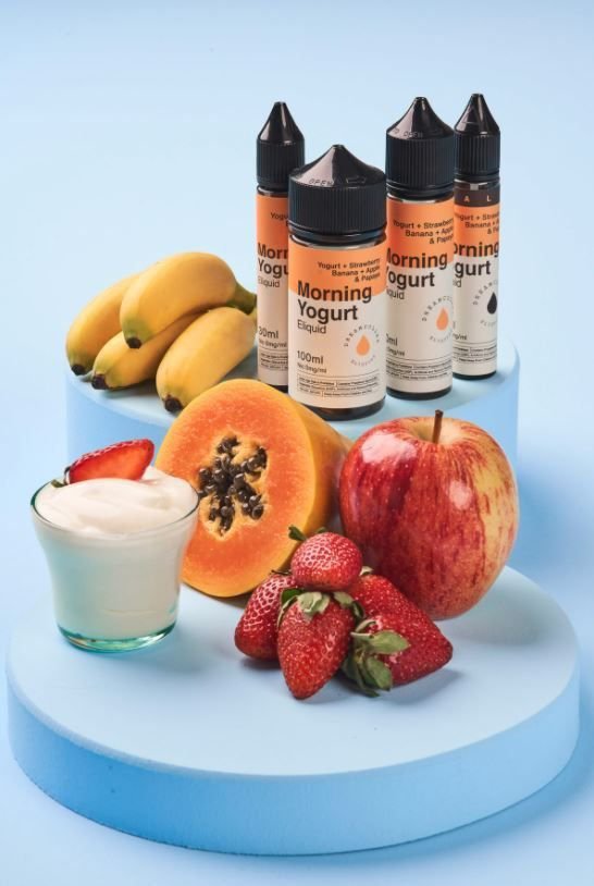 O juice nicsalt Morning Yogurt conforme dados do fabricante, é uma união de mamão papaya, banana, morangos e tudo isso batido com um iogurte fresco e de qualidade!